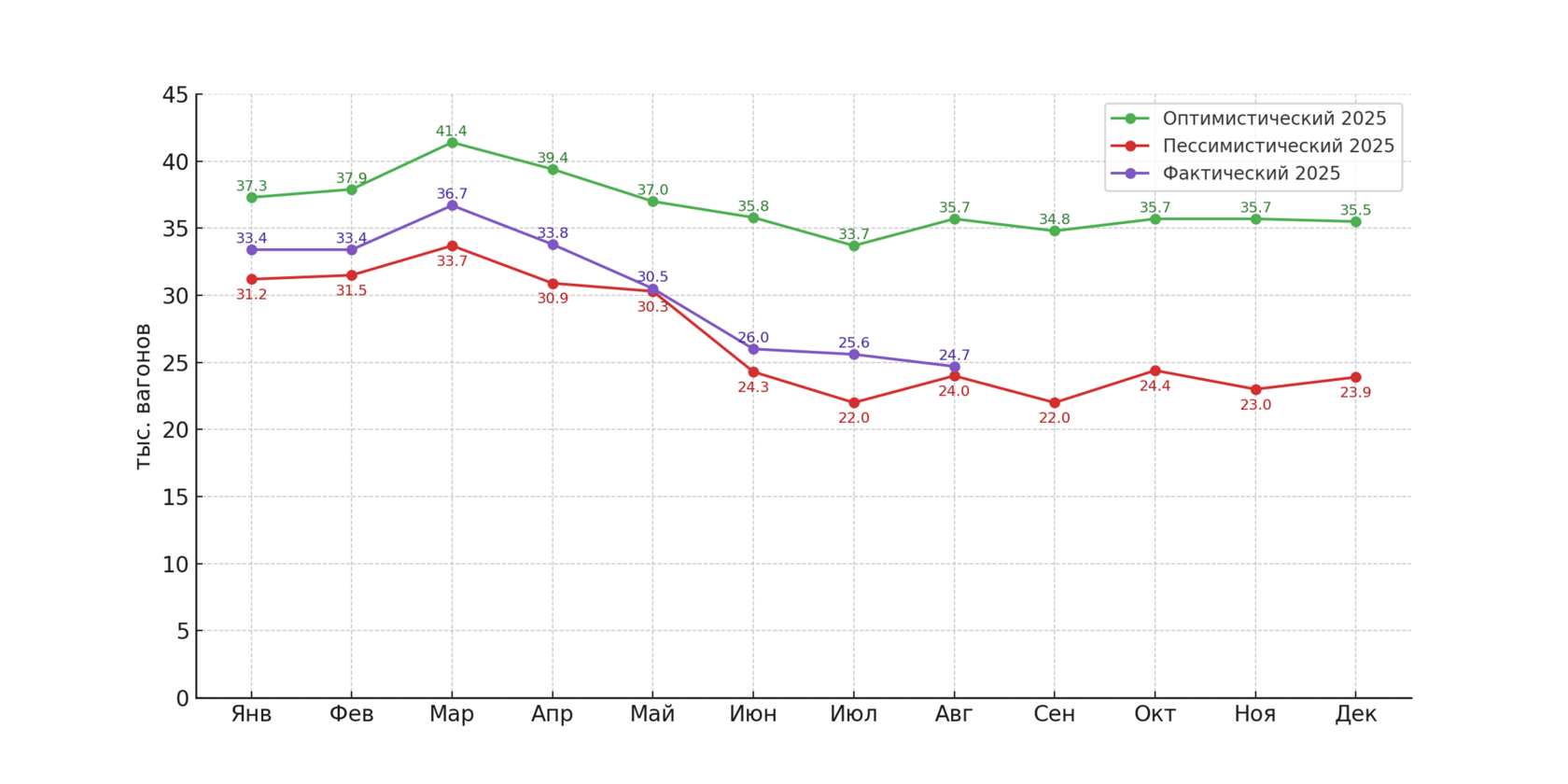 Согласно оценкам экспертов, в сентябре 2025 года объём рынка составит порядка 22,5 тыс. вагонов, а по итогам года ожидается показатель на уровне 338 тыс. вагонов. Это примерно на 24 % ниже, чем в 2024 году.